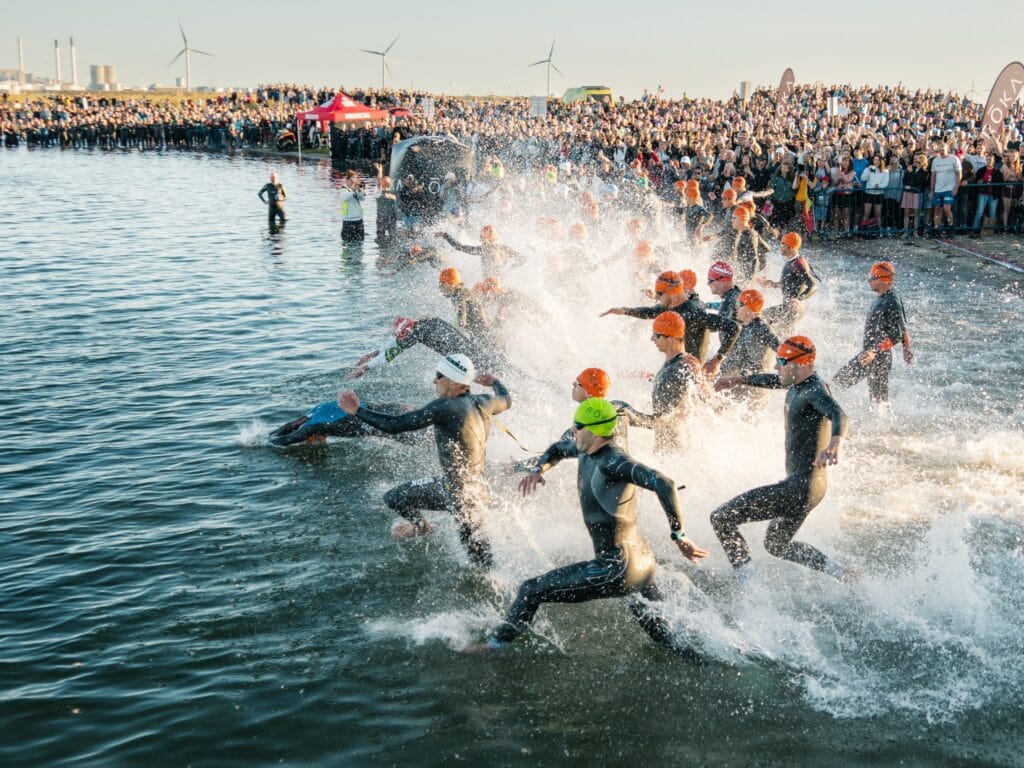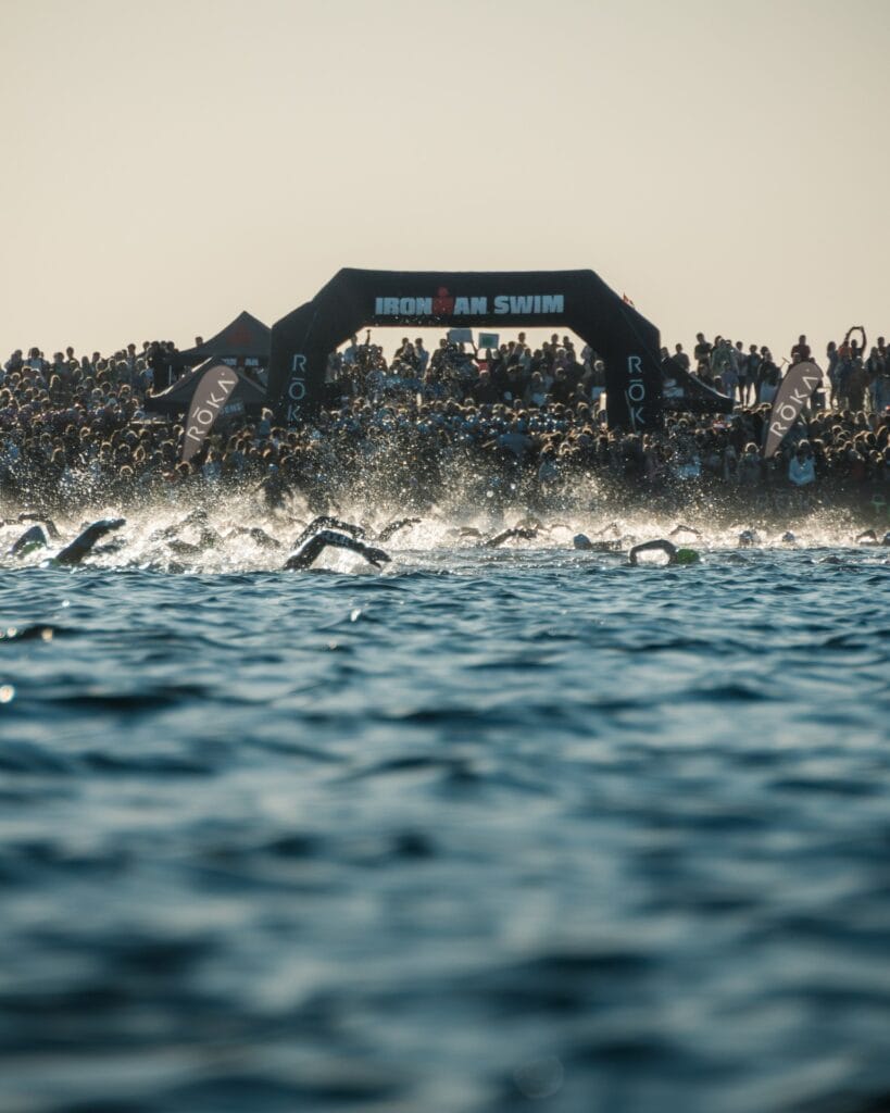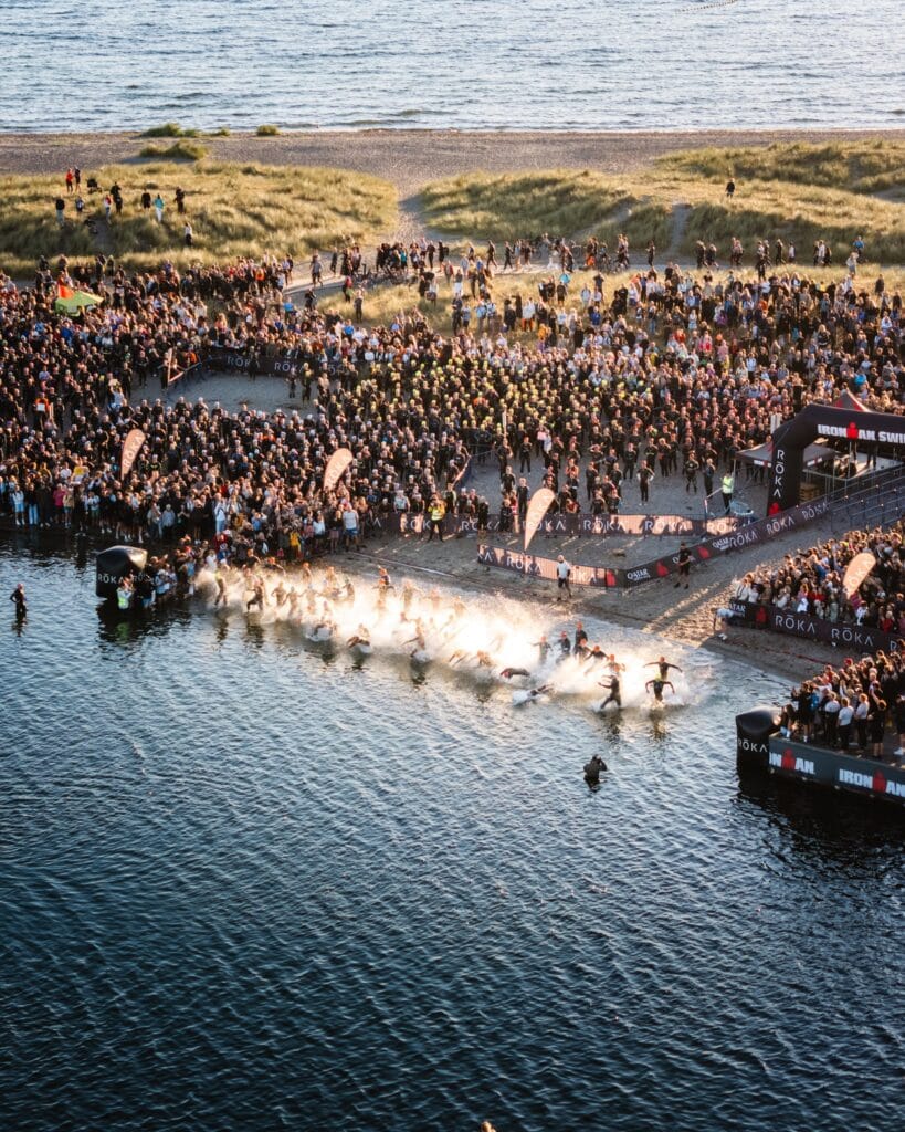 Pływanie na Ironman Copenhagen odbywa się w morskich wodach cieśniny Öresund, łączącej Morze Bałtyckie z Morzem Północnym. A dokładniej w takiej płytkiej lagunie, dzięki czemu nie ma fal, woda spokojniejsza i jak się okazało cieplejsza. Trasa jest prosta, po prostokącie, wiedzie pod dwoma mostkami, na których, oprócz tłumu kibiców, znajdują się również banery z oznaczeniem dystansu. Woda – jak na bałtycko-północną aurę przystało – dość rześka. W racebooku zapowiadali 18–19, u nas było ponoć 20 stopni. Na pewno ostatnie upalne dni sprzyjały i ją ciut podgrzały, co mnie bardzo cieszyło – każde oczko wzwyż jest naprawdę na wagę złota. Start odbywał się falami, wg zadeklarowanego czasu, co u mnie zawsze oznacza czas życzeniowy, do którego mogę się choć trochę zbliżyć za sprawą szybkich bąbelków. Byłam więc w strefie niebieskiej, tj. 1:05–1:08.