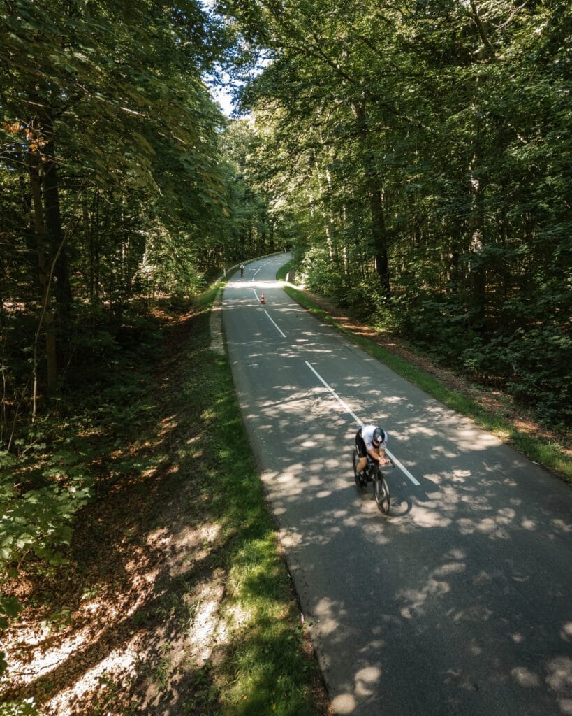 Jak mi się jechało i co to za trasa. Tak więc (pomijając ten początkowy i końcowy tor przeszkód) trasa była dość ciekawa. W sensie: na pewno nie była nudna. Ma kształt balonika na sznurku, gdzie dwie pętle przypadają właśnie na ten balonik. Były dwa wyraźniejsze podjazdy na każdym kółku (do podjechania z blata) + rolling po dość krętych, niestety nie zawsze najlepszych asfaltach. Na których dodatkowo była masa szerokich progów zwalniających. Więc na pewno nie była to trasa z tych, że wyłożysz się na baty w T1 i wstaniesz z nich w T2. Widokowo – miejscami jak u babci na Lubelszczyźnie: jechaliśmy przez pola ze zbożami i lasy.